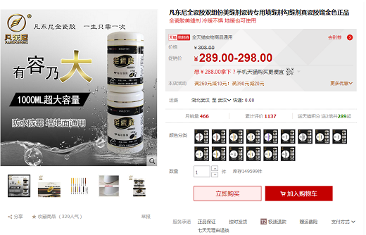 在淘宝天猫、JD等大型电子商务平台搜索“美缝剂”可以轻易看出三类美缝剂包装,其中一种是最常见的310ml直筒型灌装美缝剂,另一类就是小型包装的110ml美缝剂,最后一种就是瓶装的1000ml美缝剂。