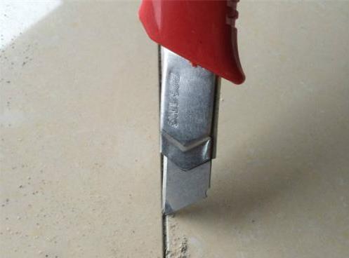 1、在准备施工时,将瓷砖缝隙清理干净,先用工具将瓷砖缝隙清理出2毫米深的凹槽,这样不但施工方便,而且美观的缝隙可以深入凹槽深处,能有效避免以后的过度磨损和翘边。